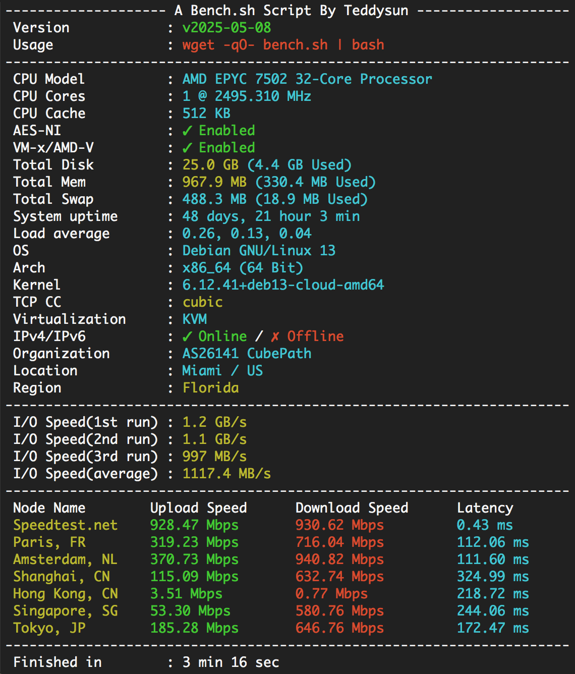 # ## ## ## ## ## ## ## ## ## ## ## ## ## ## ## ## ## # # Yet-Another-Bench-Script # # v2024-12-17 # # https://github.com/masonr/yet-another-bench-script # # ## ## ## ## ## ## ## ## ## ## ## ## ## ## ## ## ## # Thu Dec 15 09:45:10 UTC 2024 Basic System Information: --------------------------------- Uptime : 33 days, 10 hours, 15 minutes Processor : AMD EPYC-Milan Processor CPU cores : 32 @ 2399.998 MHz AES-NI : ✔ Enabled VM-x/AMD-V : ✔ Enabled RAM : 61.3 GiB Swap : 0.0 KiB Disk : 393.7 GiB Distro : Debian GNU/Linux 12 (bookworm) Kernel : 6.8.12-4-pve VM Type : NONE IPv4/IPv6 : ✔ Online / ✔ Online IPv6 Network Information: --------------------------------- ISP : OVH SAS ASN : AS16276 OVH SAS Host : OVH Location : Gravelines, Hauts-de-France (HDF) Country : France fio Disk Speed Tests (Mixed R/W 50/50) (Partition /dev/sda1): --------------------------------- Block Size | 4k (IOPS) | 64k (IOPS) ------ | --- ---- | ---- ---- Read | 323.10 MB/s (80.7k) | 2.05 GB/s (32.1k) Write | 323.96 MB/s (80.9k) | 2.06 GB/s (32.3k) Total | 647.06 MB/s (161.7k) | 4.12 GB/s (64.5k) | | Block Size | 512k (IOPS) | 1m (IOPS) ------ | --- ---- | ---- ---- Read | 2.33 GB/s (4.5k) | 2.39 GB/s (2.3k) Write | 2.45 GB/s (4.7k) | 2.55 GB/s (2.4k) Total | 4.78 GB/s (9.3k) | 4.94 GB/s (4.8k) iperf3 Network Speed Tests (IPv4): --------------------------------- Provider | Location (Link) | Send Speed | Recv Speed | Ping ----- | ----- | ---- | ---- | ---- Clouvider | London, UK (10G) | 3.91 Gbits/sec | 3.92 Gbits/sec | 5.08 ms Eranium | Amsterdam, NL (100G) | 3.90 Gbits/sec | 3.88 Gbits/sec | 11.1 ms Leaseweb | Singapore, SG (10G) | 1.10 Gbits/sec | 834 Mbits/sec | -- Clouvider | Los Angeles, CA, US (10G) | 1.23 Gbits/sec | 1.28 Gbits/sec | 138 ms Leaseweb | NYC, NY, US (10G) | 1.63 Gbits/sec | 2.47 Gbits/sec | -- Edgoo | Sao Paulo, BR (1G) | 802 Mbits/sec | 916 Mbits/sec | 185 ms iperf3 Network Speed Tests (IPv6): --------------------------------- Provider | Location (Link) | Send Speed | Recv Speed | Ping ----- | ----- | ---- | ---- | ---- Clouvider | London, UK (10G) | 3.86 Gbits/sec | 3.86 Gbits/sec | 4.24 ms Eranium | Amsterdam, NL (100G) | 3.84 Gbits/sec | 3.82 Gbits/sec | 10.1 ms Leaseweb | Singapore, SG (10G) | 404 Mbits/sec | 991 Mbits/sec | 161 ms Clouvider | Los Angeles, CA, US (10G) | 960 Mbits/sec | 1.28 Gbits/sec | 137 ms Leaseweb | NYC, NY, US (10G) | 2.18 Gbits/sec | 2.40 Gbits/sec | 76.2 ms Edgoo | Sao Paulo, BR (1G) | 734 Mbits/sec | 913 Mbits/sec | 184 ms Geekbench 6 Benchmark Test: --------------------------------- Test | Value | Single Core | 2007 Multi Core | 16712 Full Test | https://browser.geekbench.com/v6/cpu/xxxxxx YABS completed in 10 min 57 sec